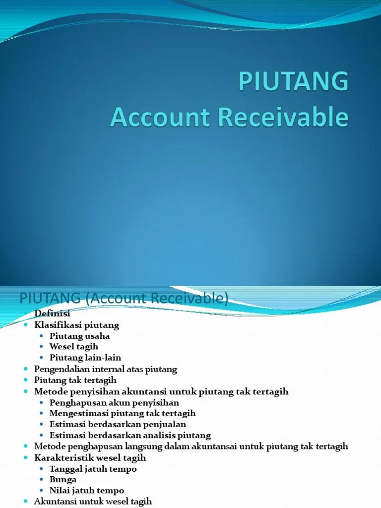 Estimasi penyisihan piutang tak tertagih (yang besarannya beada dalam diskresi manajemen) akan mempengaruhi laba melalui beban piutang tak tertagih. Brown melaporkan beban piutang tak tertagih dalam laporan . Metode penyisihan piutang tidak tertagih. Untuk jumlah material yang besar, metode penyisihan lebih . Dalam metode ini, perusahaan menentukan jumlah piutang tak tertagih berdasarkan taksiran atau estimasi. Penyisihan piutang tak tertagih rp. Perusahaan menentukan jumlah piutang tak tertagih berdasarkan taksiran atau estimasi. Jika terjadi penjualan $300, maka estimasi 1% di penjualan (untuk. Mencatat beban piutang tak tertagih dengan mengestimasi jumlah piutang tak tertagih pada akhir periode akuntansi. Metode penyisihan / metode penghapusan tidak langsung (allowance method). Metode penyisihanmerupakan estimasi yang dibuat terkait dengan estimasi piutang tak tertagih daripenjualan kredit atau dari total piutang yang beredar. (untuk mencatat estimasi akun tak tertagih). Diestimasi $3,390 dari piutang akan tidak dapat tertagih dan saldo penyisihan piutang tak tertagih sekarang sebesar .